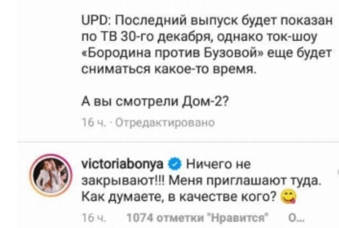 «Ничего не закрывают!!! Меня приглашают туда. Как думаете, в качестве кого?», — гласит комментарий Бони. Она, очевидно, намекнула на роль ведущей телепроекта.
