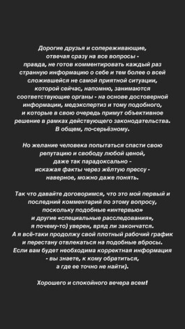 Однако такая версия событий не устроила Павла Прилучного. Актер, уклонявшийся от любых комментариев о ЧП, решил прервать молчание. Короткое заявление появилось на его странице в Instagram.