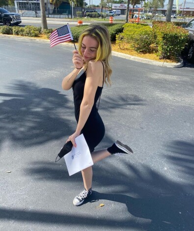 Девушка предстала в облегающем черном сарафане, который подчеркнул ее точеную фигуру. Образ она дополнила удобными тряпочными кедами в тон и сумкой на массивной цепочке. В руках Елизавета держала документы и американский флаг. Девушка радостно улыбалась, не в силах сдержать бурю эмоций. «Теперь я официально американка», — с гордостью сообщила поклонникам Елизавета.