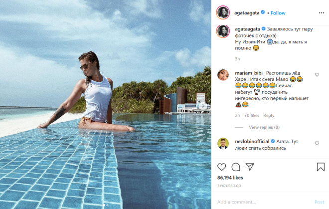 Одним из первых на пост звезды «Закрытой школы» отреагировал комик Александр Незлобин. «Агата. Тут люди спать собрались», — прокомментировал он смелый поступок артистки. «Спокойной ночки», — кокетливо ответила ему она.