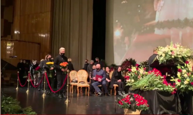 Гроб с умершим разместили на сцене. Пока прибывшие выстраивались в очередь, чтобы проститься, на большом экране показывали фотографии Бориса Юрьевича.