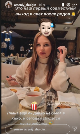 Оказалось, что жена Арсения Лиана уже полгода не была в кинотеатре и соскучилась по этому развлечению. "Мы в ресторане итальянском и пойдем в киношку. Лиана очень соскучилась по кино, потому что не была там уже чертову кучу времени", — заявил сын Валерии в Instagram.