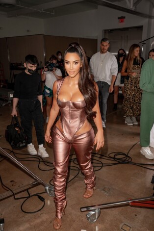 Для фотосессии стилисты подобрали предпринимательнице блестящий розовый костюм, состоящий из корсета, переходящего в брюки с заниженной посадкой, и обнажающий ее ягодицы. На размещенных в соцсети снимках видно, как ассистент помогает Кардашьян одеться, а затем она позирует на камеру.