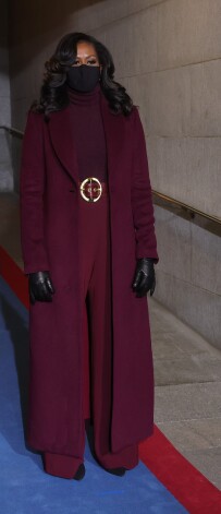 Мишель не обладает роскошной фигурой Мелании Трамп, но выглядит, на мой взгляд, ничуть не хуже. Вернее, даже лучше - потому что Мелания всегда зажата, а Мишель раскованна. Пожалуй, из всех женских нарядов на инаугурации 2021 этот мне нравится больше всего. Его простота и строгость компенсируются богатым цветом, который, между прочим, выбран не просто так. Фиолетовый получается при смешении голубого (цвет демократов) и красного (цвет республиканцев), то есть здесь намекается на то, что Америка вновь должна быть единой. Огромная пряжка на ремне намекает на то, что Мишель за себя может постоять. Кто бы сомневался…