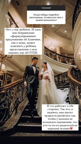 Кроме того, в Ида заявила, что не собирается раскрывать причину разрыва из-за ребенка: «У нас ребенок. И одно мое неправильно сформулированное предложение об Аланчике, как о муже, может изменить у ребенка представление о нем именно как об отце. И это работает в обе стороны. Так что я надеюсь, нам хватит мудрости разойтись так, чтобы у малыша не возникало ощущение, что кто-то из его родителей не хороший человек».