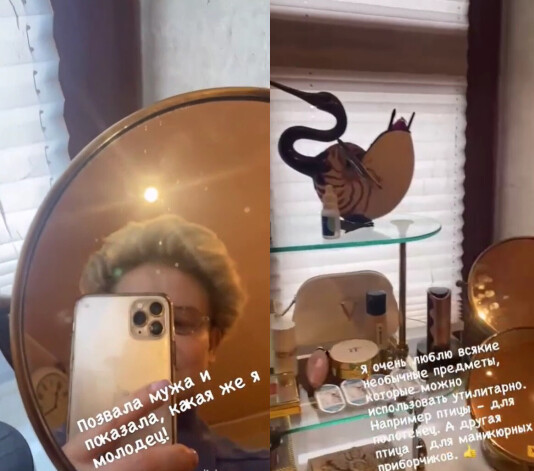 «Я очень люблю необычные предметы, которые можно использовать утилитарно. Например, птицы для полотенец. А другая птица – для маникюрных приборчиков», — объяснила телезвезда.