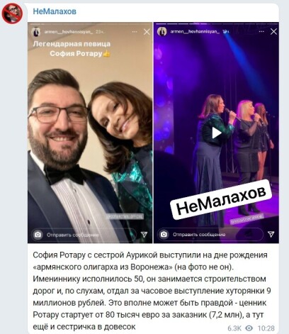 За выход Ротару на сцену, как сообщает Telegram-канал «НеМалахов», бизнесмен заплатил около 100 000 евро! София Михайловна выступила не одна, а в паре со своей сестрой.В Сети уже появились фото с мероприятия, где отметилась Ротару. Музыкант Армен Оганисян опубликовал в своём микроблоге фото со звездой. Примечательно, что кадр, похоже, не был обработан в фотошопе и артистка позирует без специальных фильтров или так называемых масок.