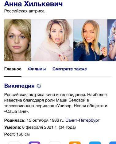 «Жесть какая. Я тут узнала от своих подписчиков, что я вчера умерла. В Яндексе обновили информацию. Я выдохнула, что умерла я вчера, а узнала об этом сегодня. Или это параллельная Вселенная?? Или, может, я сейчас пишу это, а вы не видите??? А вот сейчас страшно стало. Короче, ребят. Я живу, и всё со мной ок!» — написала Хилькевич.