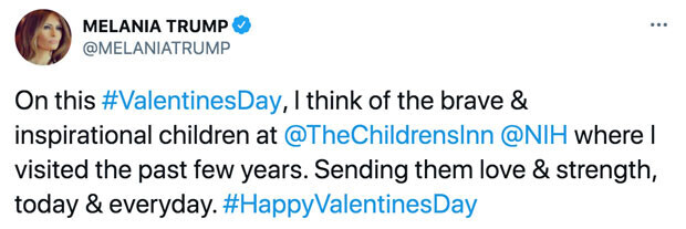 14 февраля в Twitter Мелания Трамп опубликовала два сообщения, в которых вспомнила, как навещала больных детей в больнице, и выразила им любовь. Нежными чувствами к мужу Мелания не поделилась ни в этой записи, ни в каких других.