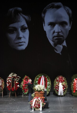 Гроб с телом звезды картины «Ирония судьбы, или С легким паром!» Андрея Мягкова буквально утонул в цветах и венках на сцене МХТ имени Чехова, где проходила траурная церемония прощания с народным артистом. Свои венки прислали многие театры, а также Министерство культуры Российской Федерации.