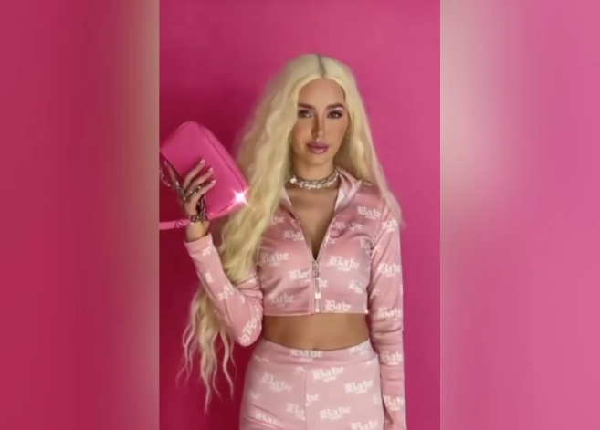 Костенко надела розовый костюм с расклешенными брюками. Инстадива использовала парик платинового оттенка и сделала кукольный макияж с акцентом на глаза. Их подчеркнули мерцающие сиреневые тени, а губы выделил карамельный блеск.