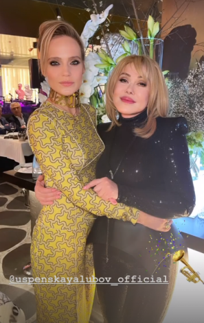 В честь события именинница облачилась в сверкающий черный комбинезон и ботильоны на шпильке. Пояс-корсет дополнил ее стильный образ и подчеркнул талию певицы. Она ходила между столиками и общалась с гостями. Настасия Шубская пришла без мужа Александра Овечкина, но ее сопровождал папа — Кирилл Шубский. Также в зале находился пресс-секретарь президента России Дмитрий Песков, модель Яна Кошкина, певица Глюк'oZa. Успенская постаралась всем уделить внимание.