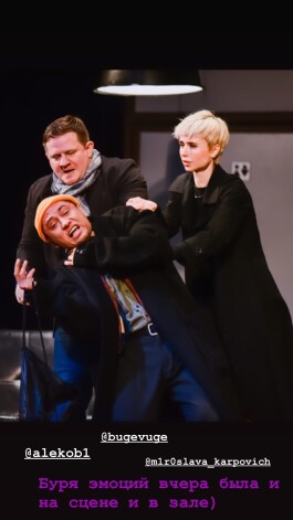 А вот неформальные снимки с Прилучным, сделанные за пределами сцены, Карпович пока не выкладывает. Зато за нее это сделал менеджер, сопровождающий артистов спектакля на гастролях. Борис Рубиновский запечатлелся с Александром Обласовым и звездной парочкой в аэропорту в ожидании вылета. На снимке Прилучный обнимает Карпович за плечи.