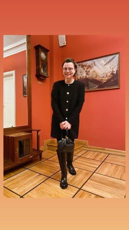 Брухунова также продемонстрировала свой стильный образ. Она выбрала черное короткое платье на пуговицах и высокие сапоги. Наряд дополнили миниатюрная сумочка и украшение для волос. Жена Евгения Вагановича широко улыбалась, позируя на фоне настенных часов и картины.
