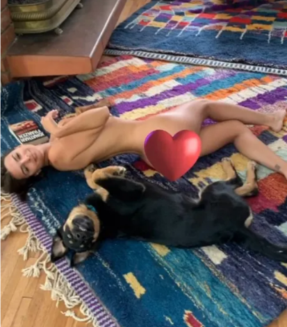 Инстадива позировала в домашней обстановке. Актриса фильма «Красотка на всю голову» расположилась на ковре рядом с любимым псом Коломбо. Молодая мама позировала полностью обнаженной, гордо демонстрируя подтянутые ягодицы и постройневшую талию. Звезда повторила позу своего питомца и мило улыбнулась.