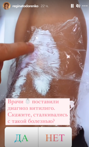 После этого Регина продемонстрировала большое белое пятно на колене, которое становится особенно заметным на загорелой коже. Диагноз звучит так: витилиго. Поэтому звезде приходится закрашивать пятно, чтобы его не было заметно.