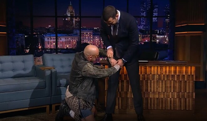 Дмитрий Нагиев устроил шоу, отрезав штанины у брюк Ивана Урганта в эфире