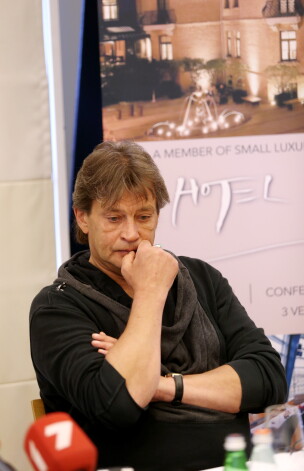 Андрей Кончаловский, Юлия Высоцкая и Александр Домогаров на пресс-конференции в Риге