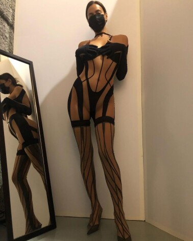 Модель опубликовала новую фотографию в своем микроблоге, на которой предстала в необычном образе. На Ирине был облегающий костюм, сделанный из полупрозрачной ткани с черными вставками. Создавалось впечатление, что Ирина позирует почти полностью обнаженной, тем более, что часть вставок были бежевого цвета. Свой дерзкий образ Шейк дополнила туфлями на каблуках и черной защитной маской.