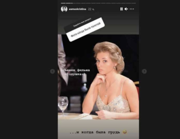 Актриса Кристина Асмус в сторис Instagram ответила на вопросы своих подписчиков. Один из них попросил звезду картины «Текст» поделиться с пользователями снимком, когда она была толстой.