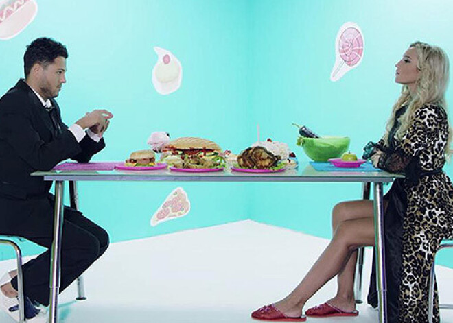 В первой половине ролика Бузова в своем привычном обличье сидит за одним столом с Георгием и всячески пытается отказаться от калорийной еды, но во второй части клипа все идет иначе — «толстая» Ольга уже лежит в ванне, полной макарон.