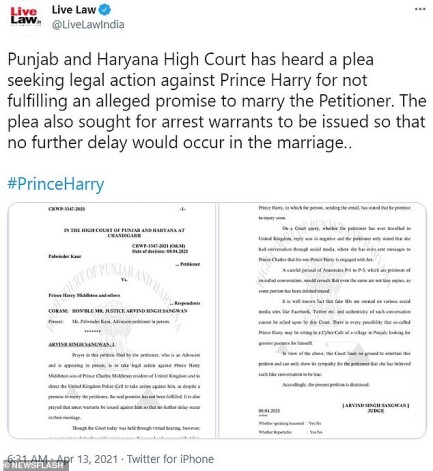 Судья отклонил прошение истицы объявить герцога Сассекского в розыск в Великобритании, чтобы доставить в Индию для совершения бракосочетания. Сама Каур никогда не бывала на родине принца и общалась с ним исключительно по переписке. По словам судьи, представленное ходатайство было составлено неверно, содержало грамматические ошибки, хотя по профессии Палвиндер Каур является юристом и предстала в суде лично, настояв на очном слушании. Кроме того, женщина не подкрепила иск никакими официальными бумагами, свидетельствующими о намерении заключить брак, а те скриншоты переписок, где «принц Гарри обещал жениться на ней как можно скорее», также, вероятно, были подделаны и содержали пробелы — некоторые сообщения на них были стерты.