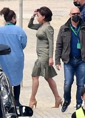 Новый наряд Леди Гаги из очередной сцены тоже произвел впечталение — правда, не совсем такое, как наверняка хотелось бы звезде. Оливково-зеленое платье, сшитое по моде тех времен, было Гаге слегка узковато. Похоже, актриса на съемках немного расслабилась или просто очень хорошо пообедала. Поэтому все интернет-пользователи на свежих снимках могли заметить ее выпирающий животик.
