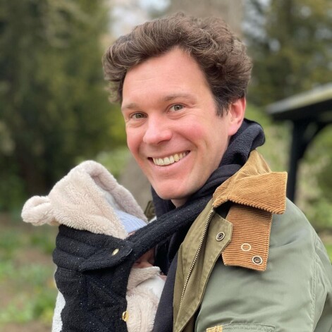Нв втором кадре Джек Бруксбэнк буквально светится от счастья, позируя с маленьким Августом в переноске, закрепленной на груди. А на последней фотографии Джек идет спиной к камере, засунув руки в карманы.