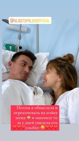 Телеведущая расположилась на соседней кровати с возлюбленным, а позже и вовсе перелегла с ним на одну кровать. «На фото я выгляжу очень плохо, почти четыре ночи не спала, очень нервничала. Сначала можно было только рядышком на раскладушке прилечь и подежурить. Потом обнаглела и перекочевала к мужу. И впервые за пять дней увидела его улыбку», — заметила Регина.