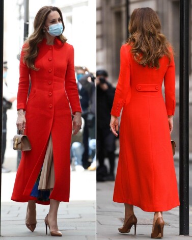 Буквально пару часов назад Кейт прибыла в музей, чтобы показать миру свой проект. Для важного выхода она выбрала алое пальто, сделанное на заказ, бренда Eponine, маленькую сумку DeMellier и бежевую плиссированную юбку.