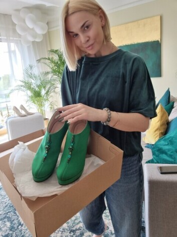 Две пары таких зеленых туфель сшиты специально для Саманты для участия в "Евровидении". Почему две? В целях безопасности - если с обувью что-нибудь случится, то будет резерв. Обувь вышита вручную, и это первый раз, когда обувь была сделана специально для Саманты, специально для одного мероприятия - для сцены "Евровидения" в Роттердаме.