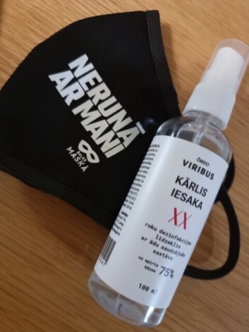 Маска из шоу Balss maskā (Голос в маске), в которой Саманта входила в состав жюри. Почему такая надпись? "Чтобы не подходили ко мне без надобности! Потому что, не дай бог, где-то кто-то заразится. Да, будут регулярные тесты на Covid-19, есть строгие правила безопасности, но излишняя осторожность пригодится, так как мы должны быть необычайно осторожными. У нашей команды будут с собой свои кружки, я сказала всем быть очень осторожными", - Саманта Тина заботится об эпидемиологической безопасности.