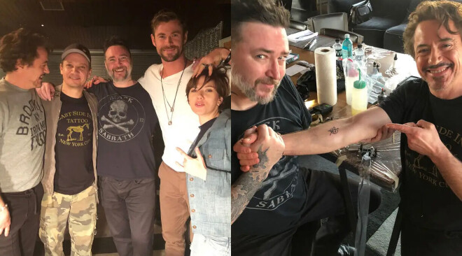 Пятеро из шестёрки оригинальных Мстителей набили одинаковые татуировки после завершения съёмок фильмов "Мстители: Война бесконечности" и "Финал", ведь тогда для многих из них закончился путь в кинематографической вселенной Marvel. Символ представляет каждого из их персонажей Marvel: Железного человека, Капитана Америку, Чёрную вдову, Тора, Соколиного глаза и Халка.