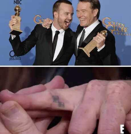 Брайан Крэнстон и Аарон Пол сделали татуировки в виде логотипа сериала "Во все тяжкие", когда их многолетние съёмки наконец закончились.