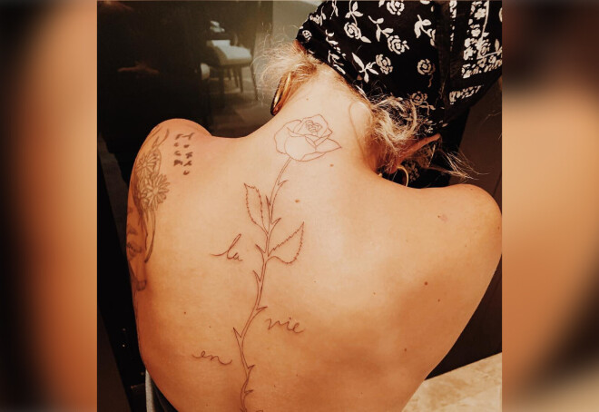 Леди Гага сделала новое тату в честь съёмок в фильме "Звезда родилась". В картине героиня певицы исполняет La Vie en Rose ("Жизнь в розовом цвете") Эдит Пиаф, поэтому теперь на спине у звезды есть изображение розы.