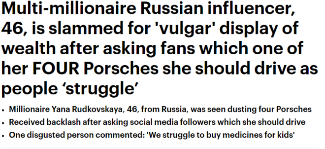 Эту публикацию Рудковской разместило британское издание Daily Mail. Иностранцы совершенно не оценили такой тяги к роскоши и, не стесняясь в выражениях, высмеяли знаменитость. "Некоторые люди так бедны, все, что у них есть, это деньги", "Бедная девочка, столько денег и нет вкуса", "Как по-русски, грубо и безвкусно", - написали иностранные читатели.