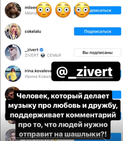 При этом блогер добавил, что слушает музыку Zivert и ему симпатизирует ее творчество. Однако Дава возмущен, как человек, поющий о любви и дружбе, может поддерживать расчленение людей. «Филипп, надеюсь, что у вас больше не будет совместных треков с людьми, которые втихаря поддерживают высказывания, что нужно отправить вас на шашлыки. При этом улыбаются в лицо и говорят о великом смысле в своих песнях. Любовь, видимо, бывает разная», - заключил Дава.