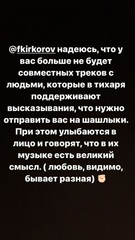 Такой жест не понравился Даве и он обвинил артистку в лицемерии, так как на мероприятии, по его словам, они вместе фотографировались и улыбались друг другу. «С этим человеком у нас есть хорошие общие друзья и знакомые. Она сделала совместный трек с Филиппом, улыбалась на премии ему в лицо. Также улыбалась мне и просила сфотографироваться, а после премии поддержала лайком высказывание о том, что нас нужно отправить на шашлыки! Серьезно? Это не верх лицемерия?», - возмутился Манукян.