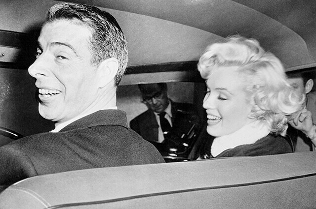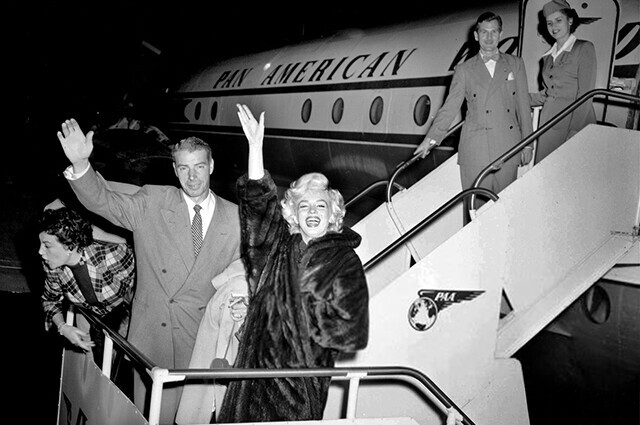 Джо Ди Маджио и Мэрилин Монро приветствуют репортеров 24 января 1954 года. Они только что прилетели в Сан-Франциско с Гавайев, где провели свой медовый месяц.