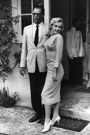 Мэрилин Монро со своим третьим мужем, драматургом Артуром Миллером, на пороге дома Парксайд-Хаус в деревне Энглфилд-Грин, Суррей, Великобритания. Там молодожены провели в 1956 году четыре месяца, включая свой медовый месяц, так как Монро в то время работала над фильмом «Принц и танцовщица» с Лоуренсом Оливье. Знаменитый актер и его супруга Вивьен Ли позируют вместе с молодоженами на втором снимке.