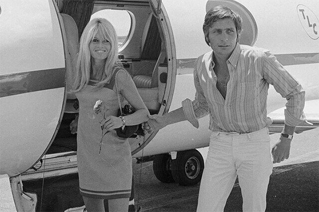Французская кинозвезда Брижит Бардо и ее новый муж Гюнтер Закс фон Опель после секретной свадьбы в Лас-Вегасе 13 июля 1966 года позволили себе роскошный медовый месяц. Сначала репортеры запечатлели их у борта частного самолета в Калифорнии на следующий день после свадьбы, перед там как они отправились в Мексику и на Таити. Ну а потом пара попала в объективы уже в Нью-Йорке, откуда они вылетали в Европу, чтобы продолжить отдых.