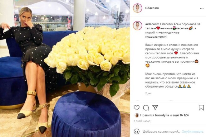 Букет, похожий и по цвету, и по количеству роз запечатлела и звездный косметолог Аида Гаджиева. Врач и по совместительству подруга Бородиной выложила на своей странице в Instagram показала себя, сидящей на том же диване — на фоне цветы, которые девушка судя по всему получила в подарок на свой день рождения.