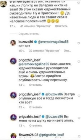 «Оказывается художественные руководители еще и очень художественные вруны. Опубликую нашу переписку, и тогда посмотрим, кто врет», — сказал Пригожину. «Вы меня не на шутку начинаете злить», — отдельно к Ольге обратился Иосиф.