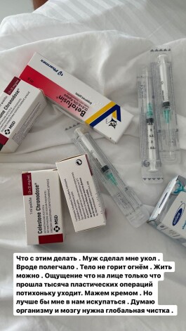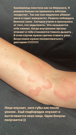 Седокова призналась, что первое время все было хорошо, но буквально сегодня утром она проснулась из-за плохого самочувствия. У певицы отекло лицо, а тело покрылось ярко-красными пятнами. Анна чувствовала себя плохо, у нее начался отек Квинке. К счастью, приступ удалось быстро купировать. Знаменитости пришлось связаться с лечащим врачом, чтобы понять, как быть дальше.