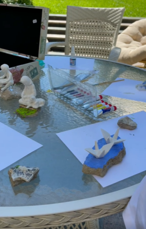 Пугачева вместе с дочерью превратили камни в импровизированную зеленую лужайку и лазурный водоем. Поверх преобразившихся камней Лиза и Алла Борисовна наклеили фигурки из белого гипса, которые им подарили родственники. «Можно, конечно, и фигурки разрисовать. Но мне нравятся они беленькими», — резюмировала Пугачева.