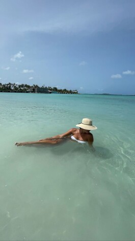 Так, за несколько дней Нюша успела загореть. Почти все время она проводит на пляже с дочкой, которая любит играть в песке. Певица позволяет себе есть сладости и мороженое. Также она охлаждается, купаясь в океане. Нюша поделилась пикантным фото, на котором лежит прямо в лазурной воде в белоснежном купальнике-бандо. Он еще больше подчеркнул ее бронзовый загар. Шляпка дополнили образ.