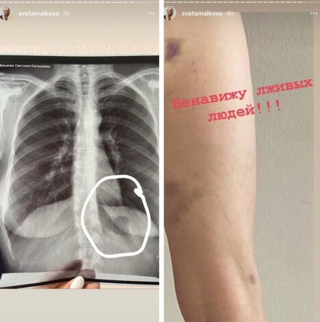 Помимо записи произошедшего Светлана также опубликовала заключение из больницы и рентгеновский снимок своей грудной клетки. Серьезных последствий для здоровья Мальковой столкновение с Макеевой за собой не повлекло, однако бывшая жена супруга актрисы получила многочисленные ушибы. В доказательство Светлана приложила не только рентгенографию, но также фото синяков на своих бедрах.