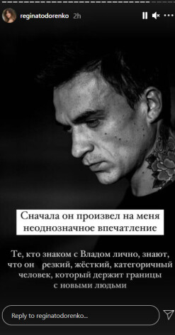 "Сначала он произвел на меня неоднозначное впечатление, - продолжила Регина Тодоренко. - Те, кто знаком с Владом лично, знают, что он резкий, жесткий, категоричный человек, который держит границы с новыми людьми".