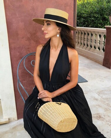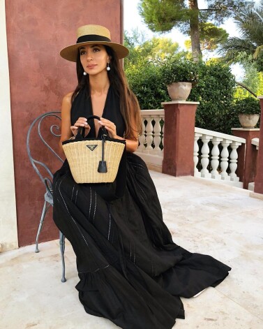 В главной роли образа оказалось черное макси-платье с пышной юбкой, декорированной мерцающими вставками. Скромность длины компенсировано экстремально глубоким декольте, достигшим середины талии (берем на вооружение лиф-халтер). Дополнил аутфит сет из плетеных аксессуаров: узнаваемая сумка-корзинка Prada и шляпка-канотье — неотъемлемая деталь летних образов Зары. Акцентный штрих — пара жемчужных серег.