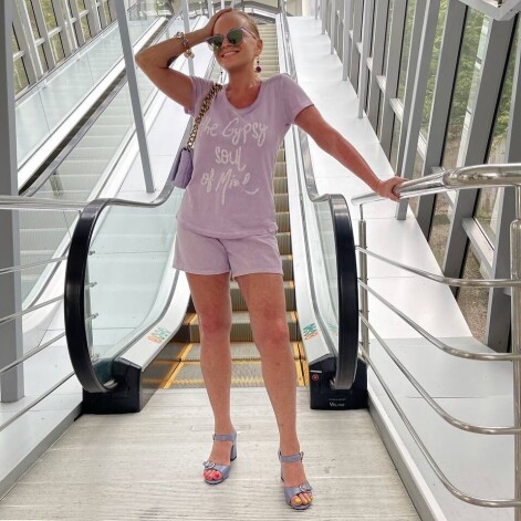 Лариса Долина выбрала притаенную футболку и мини-шорты под цвет нежно-фиолетового верха аутфита. Певица дополнила образ очками с оправой-«кошачий глаз». К слову, очки тоже были сиреневого цвета. Лариса Александровна повесила на одно плечо лиловую стеганую сумочку на золотой цепочке. А на ноги артистка надела босоножки среднего пурпурного цвета.
